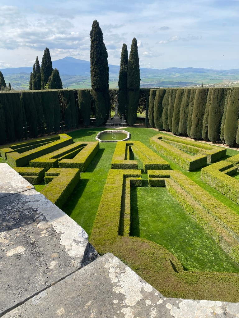 In 1924, writer Iris Origo, granddaughter of William Bayard Cutting and Hamilton Cuffe, the 5th Earl of Desart, joined Antonio Origo, son of Marchese Clemente Origo, in buying what was by then a very dilapidated estate. They moved there after their marriage. The late 15th-century villa was restored by the Origos in the 1920s with government financial assistance. The fine gardens were designed by the English architect Cecil Pinsent: “the last great Italian garden by Pinsent” in the words of horticulturist television presenter Monty Don. Pinsent had created several other gardens in Tuscany, including those at Villa Le Balze and Villa I Tatti, where Iris’s mother was a frequent guest of Bernard Berenson. Berenson had commissioned Pinsent’s first Italian garden about twenty years earlier.