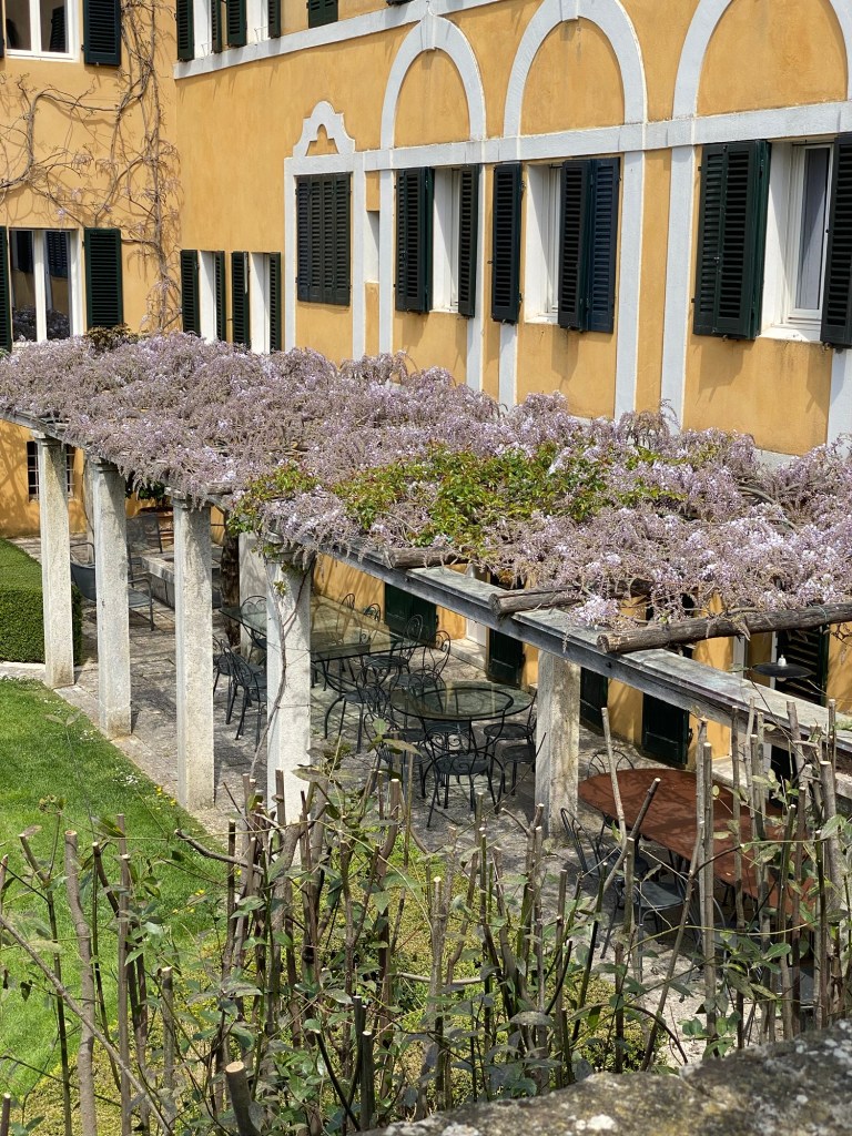 Unfortunately, our visit was not timed for the bloom of the wisteria that makes such a statement on the arbor which you can see in the photos above and below. If you look closely and use your powers of perception, you can just make out a lavender haze running along the flat surface of the arbor that exists just above the first floor and below the second.
