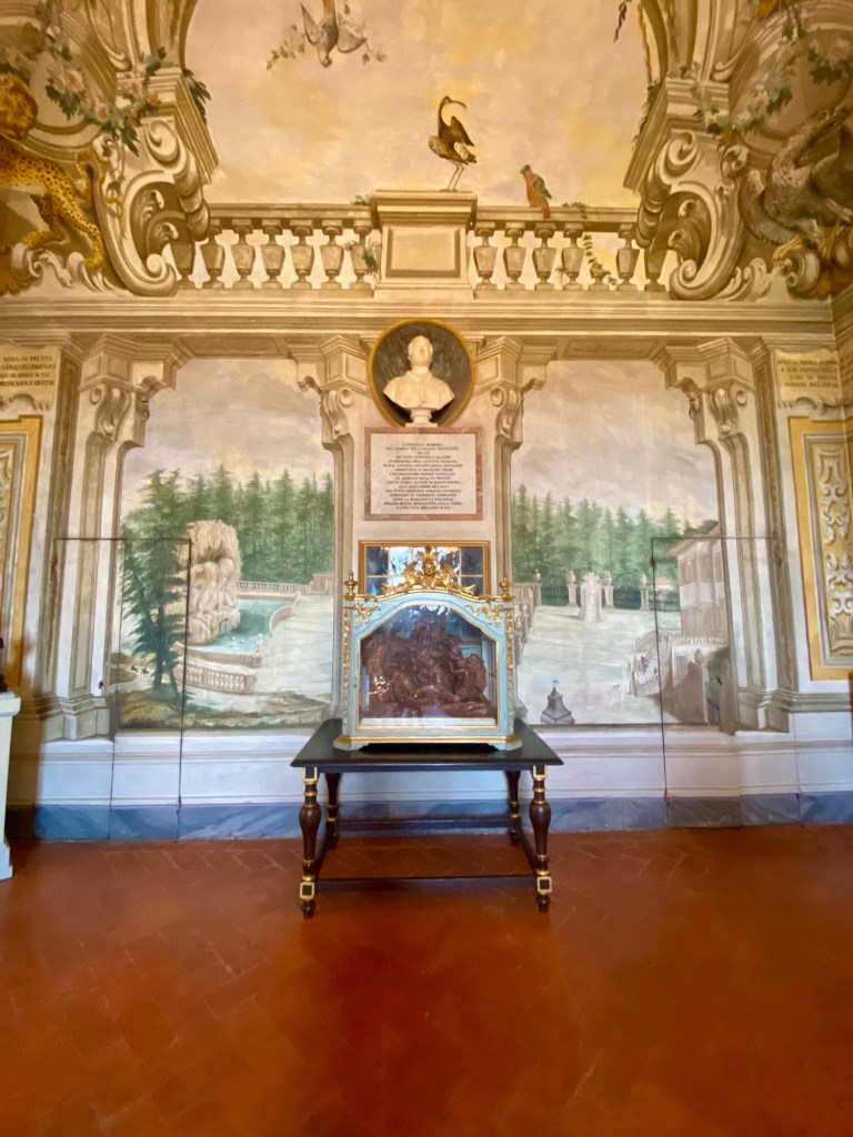 If you take the guided tour of the Villa, you will, as I did, get to see the frescoed apartment of the Electress Palatine, the Church of the Holy Trinity with the Lower Choir, the 17th-century Pharmacy, and a collection of works by Renaissance artists such as Sandro Botticelli and Ridolfo del Ghirlandaio. Notably, the Baroque garden, the subject of my last post, is in the 18th-century form envisioned by the Electress Palatine and just opened to the public for the first time in spring 2025, after a careful restoration made possible thanks to EU PNRR funding.