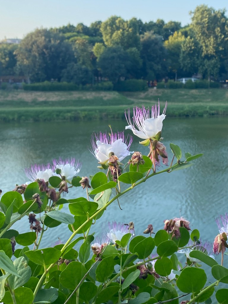 And finally, a walk along the Arno provides some nature to offset the manmade. I love the pretty blossoms on these caper plants that self-seed and grow on the stone walls in Tuscany.
