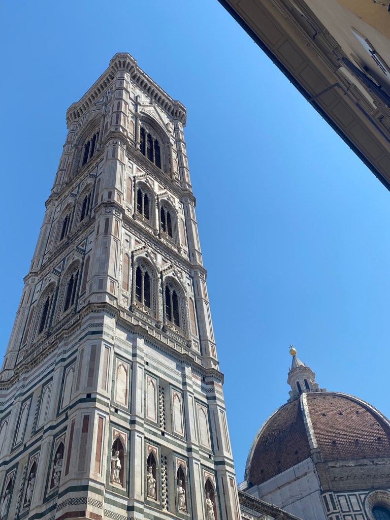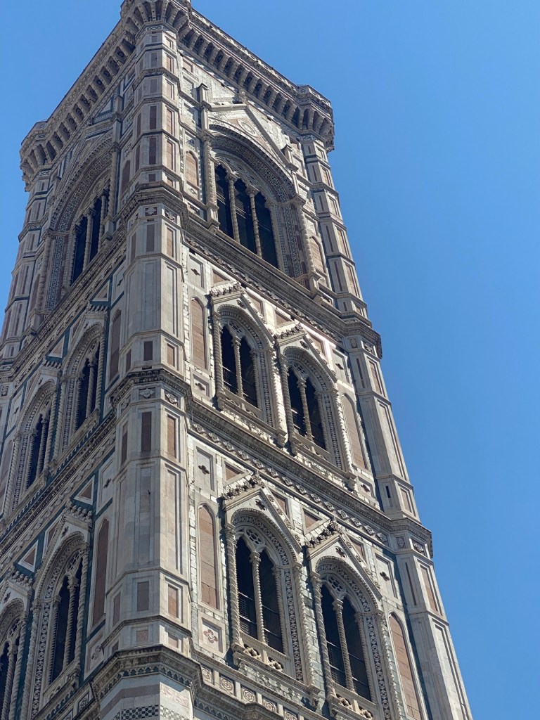 Walking a bit took me by the Duomo, and today, in the heat and under that famous Tuscan sun, the campanile reflected to sun as if it were a mirror. I tried to capture it with my camera, but you may have to take my word for it.