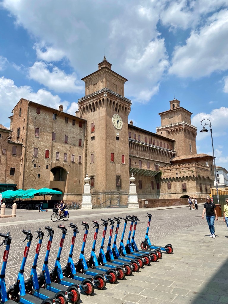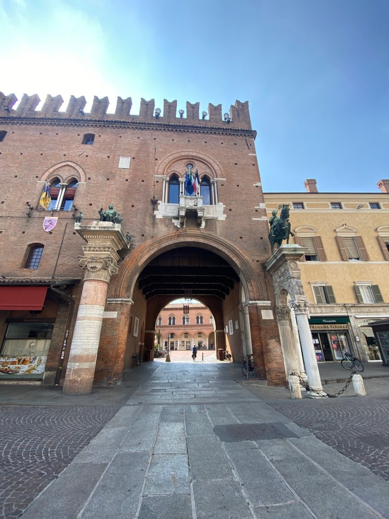 You can’t visit Ferrara and miss the palazzo that was home to the Este dynasty, at least from the outside. It is huge and takes up a lot of space in the historic center. It’s make of red brick, for the area was lacking in stone that could be used for building. And, unlike most Italian former palaces, it is surrounded by its moat.