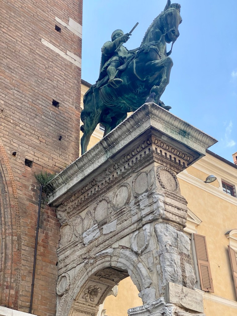 Flanking the grand arched entrance of the building are two statues: on the left is a seated figures of Duke Borso d’Este and on the right is the equestrian statue of Marchese Niccolo III d’Este. The Duke holds a scepter and is depicted as if administering justice.