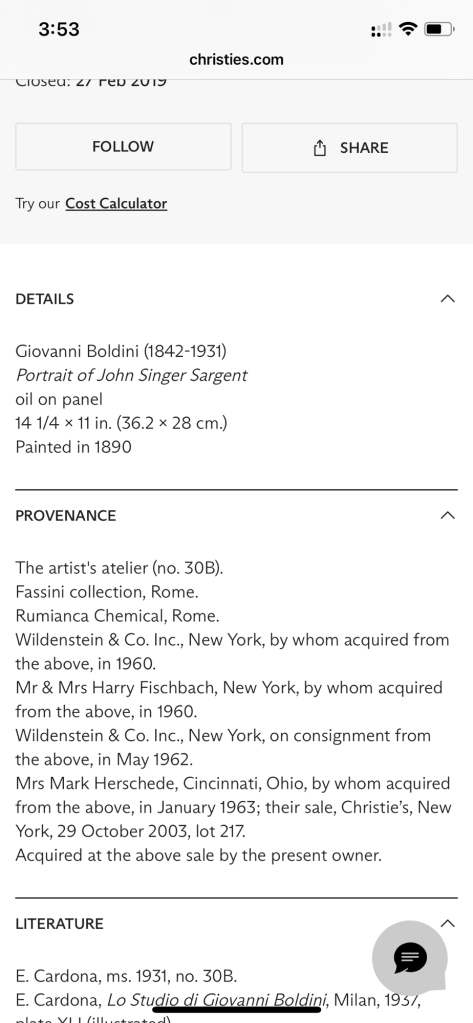 In 1886, Boldini took over Sargent’s Paris studio when Sargent moved to London, further cementing their professional and personal connection. They maintained contact over the years, sharing artistic ideas and social networks in Paris and London and both were leading portraitists of their era. They shared a prominent standing in producing the most famous portraits of the European world of the Belle Epoche.
