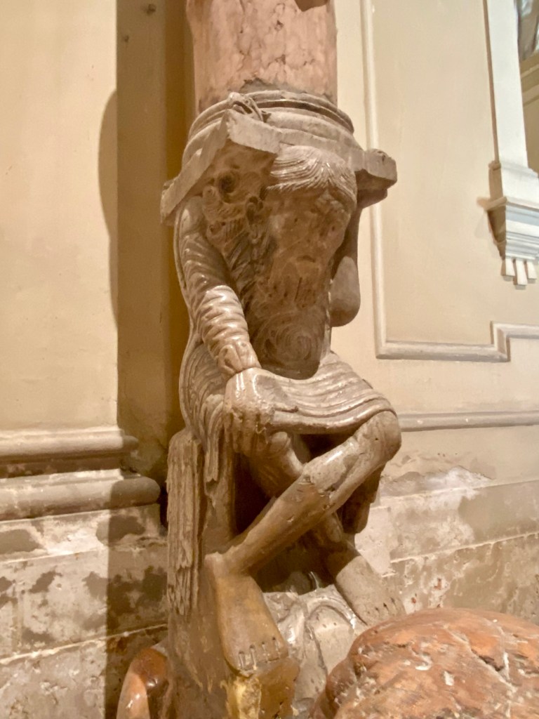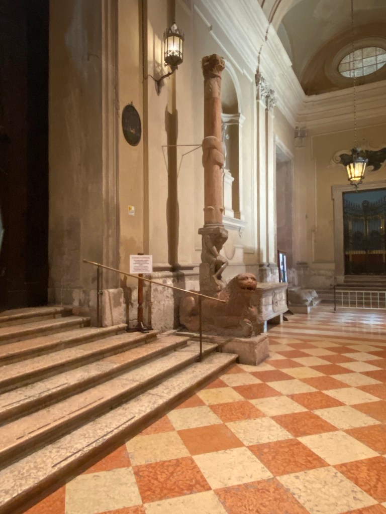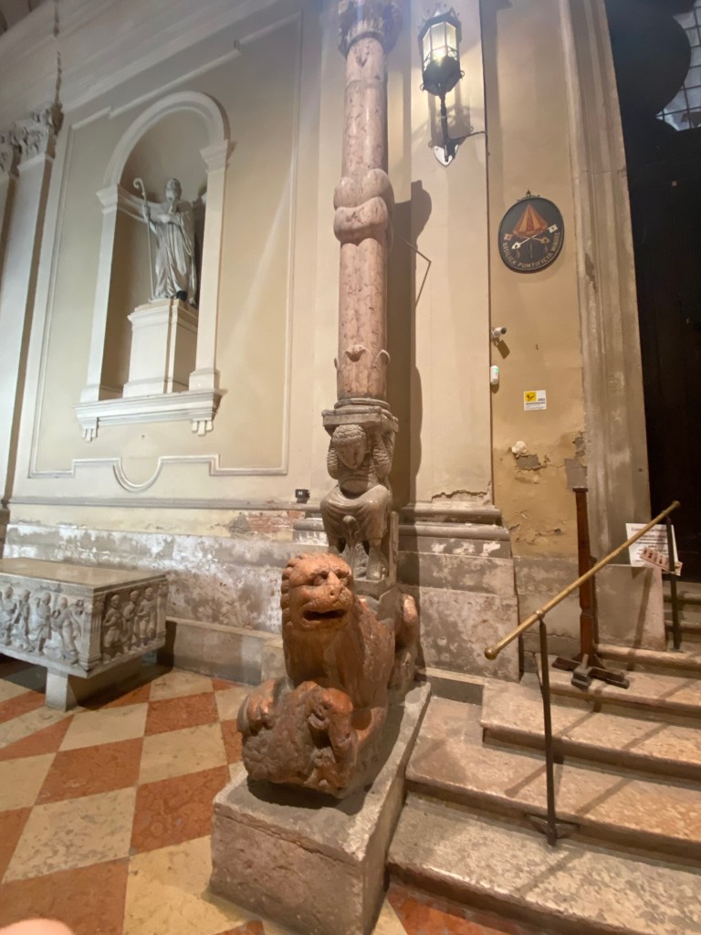 But, what is interesting is that Ferrara has kept aspects of the Medieval entrance to the church and housed it in a covered vestibule attached to the front of the church. The next few shots show this entryway and its sculptural adornment as currently arranged. It is badly aged, but the “bones” are still there.