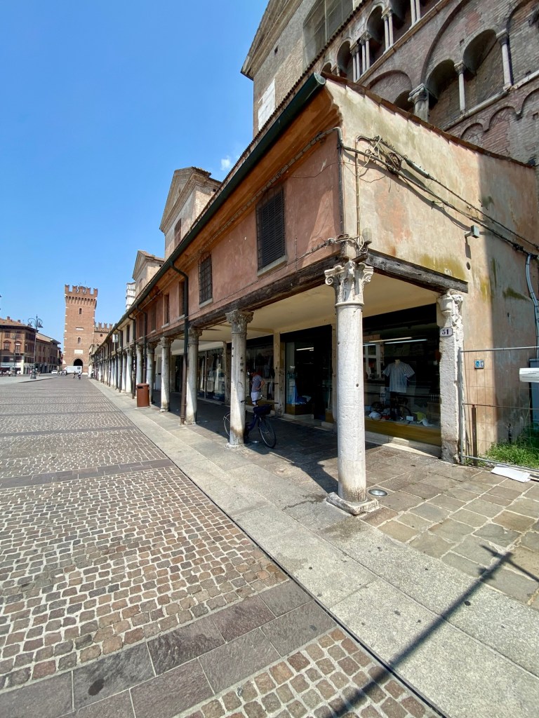 I’ve only seen this use of church walls for commercial space in one other place: in Mantova (Mantua) the same thing occurs on the side of the Basilica di Sant’Andrea. If you look at a map, Ferrara and Mantua are only 56 miles distant. Stylistic similarities are not that surprising, given this closeness. And Alberti was active in Mantua as well, so the possibility of his working in Ferrara is also not surprising.