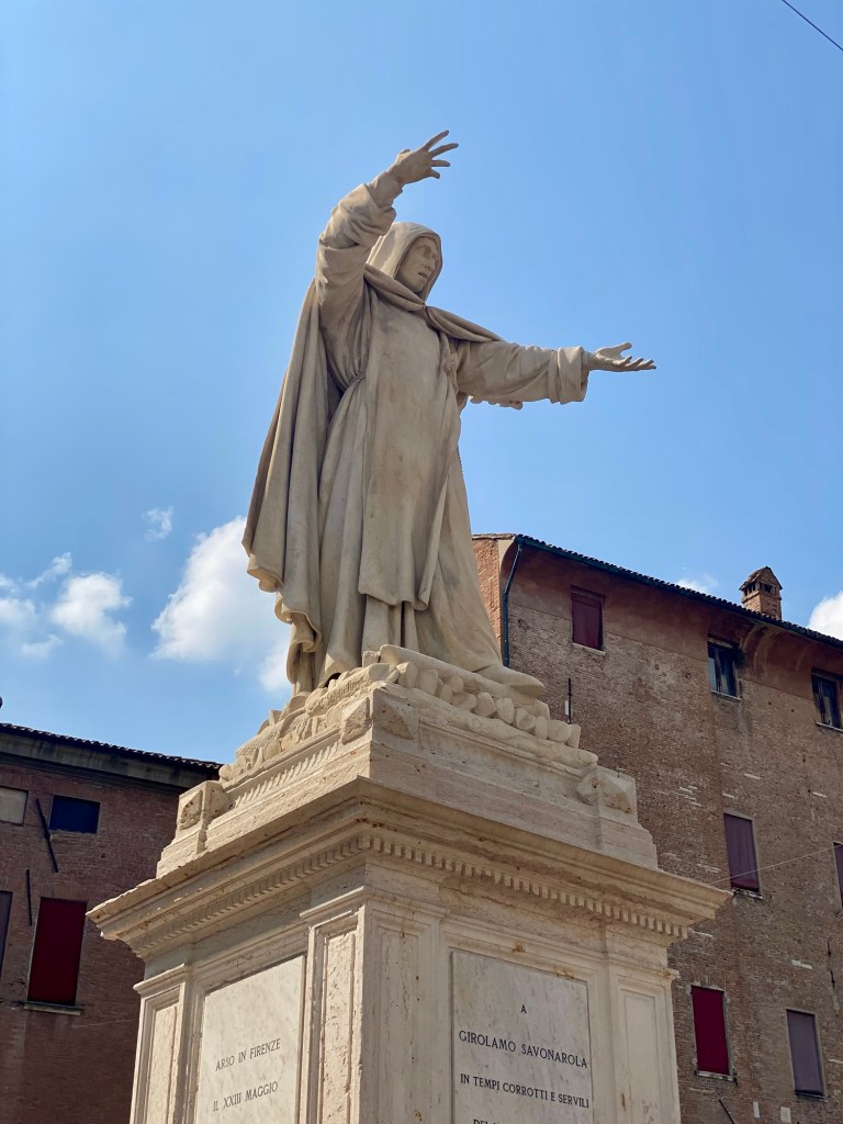 He’s commemorated in Ferrara with this statue depicting him in the process of delivering one of his fiery sermons. His importance is shown by the placement of the work of art: it’s in a wide open square surrounded by the city’s most important civic and religious buildings. I got the chills when I walked by the statue, knowing the history of this man the way I do.
