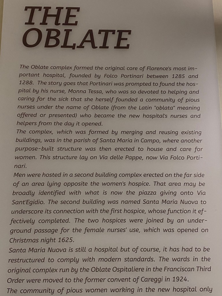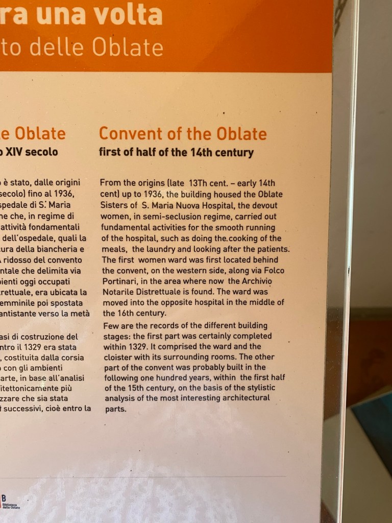 Did you read above that the hospital, which is what the Oblate was founded as, was funded by Falco Portinari? Did that name ring a bell for you? He was the father of Beatrice, who was the muse for Dante’s Divine Comedy of course.