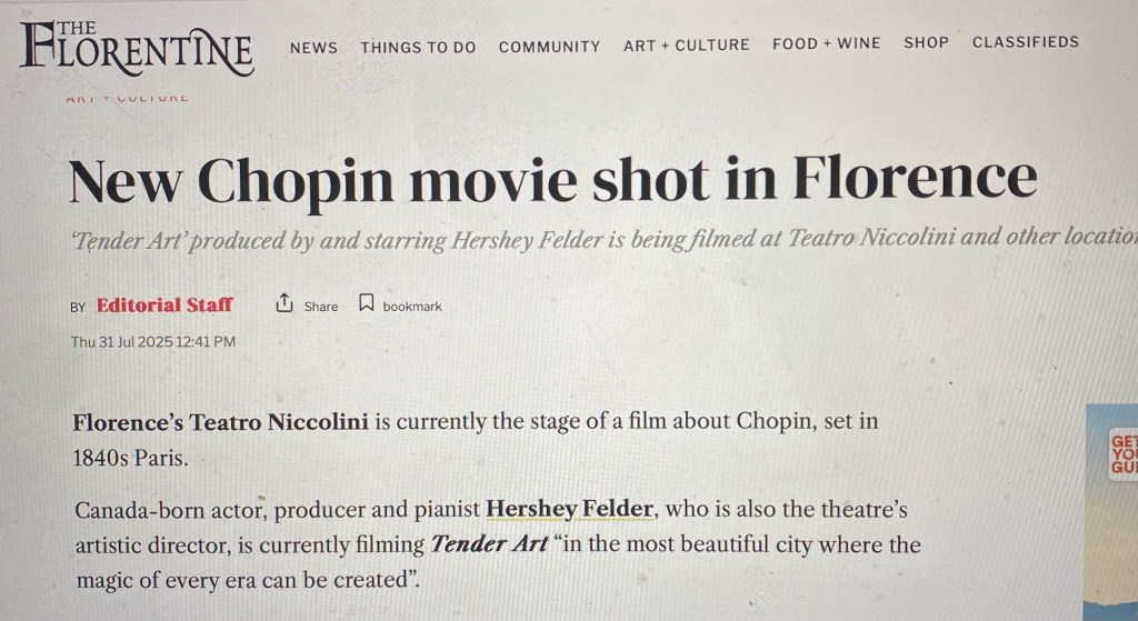 New film on Chopin being filmed now in Florence August 10, 2025July 31, 2025 / get back, laurettadimmick Looking forward to seeing Tender Art in the future! https://www.theflorentine.net/2025/07/31/new-chopin-movie-shot-florence/ Share this: Click to share on X (Opens in new window) X Click to share on Facebook (Opens in new window) Facebook More Click to share on Reddit (Opens in new window) Reddit Click to share on Tumblr (Opens in new window) Tumblr Click to share on Pocket (Opens in new window) Pocket Click to share on Pinterest (Opens in new window) Pinterest Click to print (Opens in new window) Print Click to share on LinkedIn (Opens in new window) LinkedIn Click to email a link to a friend (Opens in new window) Email Like Loading...
