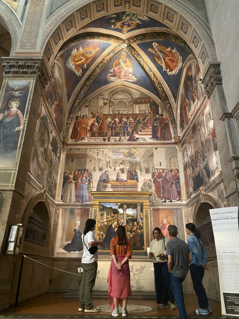 The standout of this church for me is this set of 15th century frescoes by the painter Ghirlandaio. I adore his work. You might have heard about him if you know anything about the life of Michelangelo; the future painter of the Sistine Chapel ceiling was apprenticed with Ghirlandaio in the late 1480s and learned the technique of fresco painting from the older master.