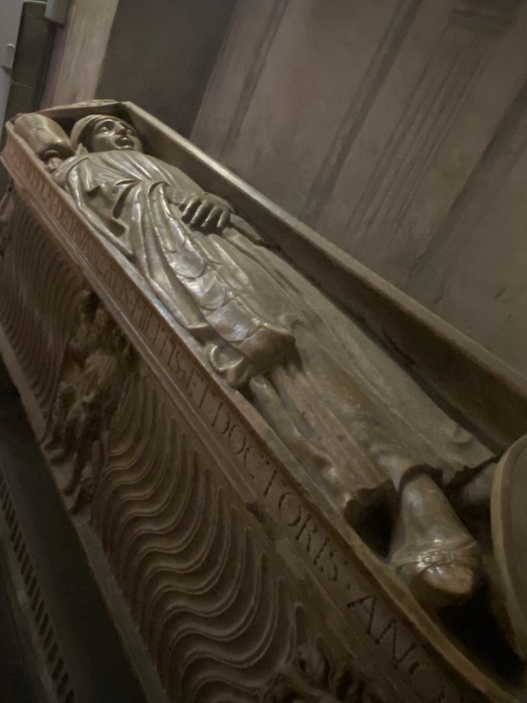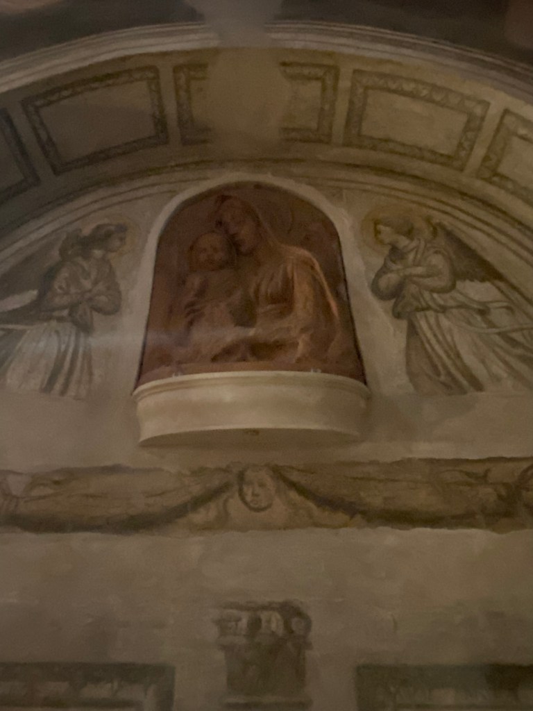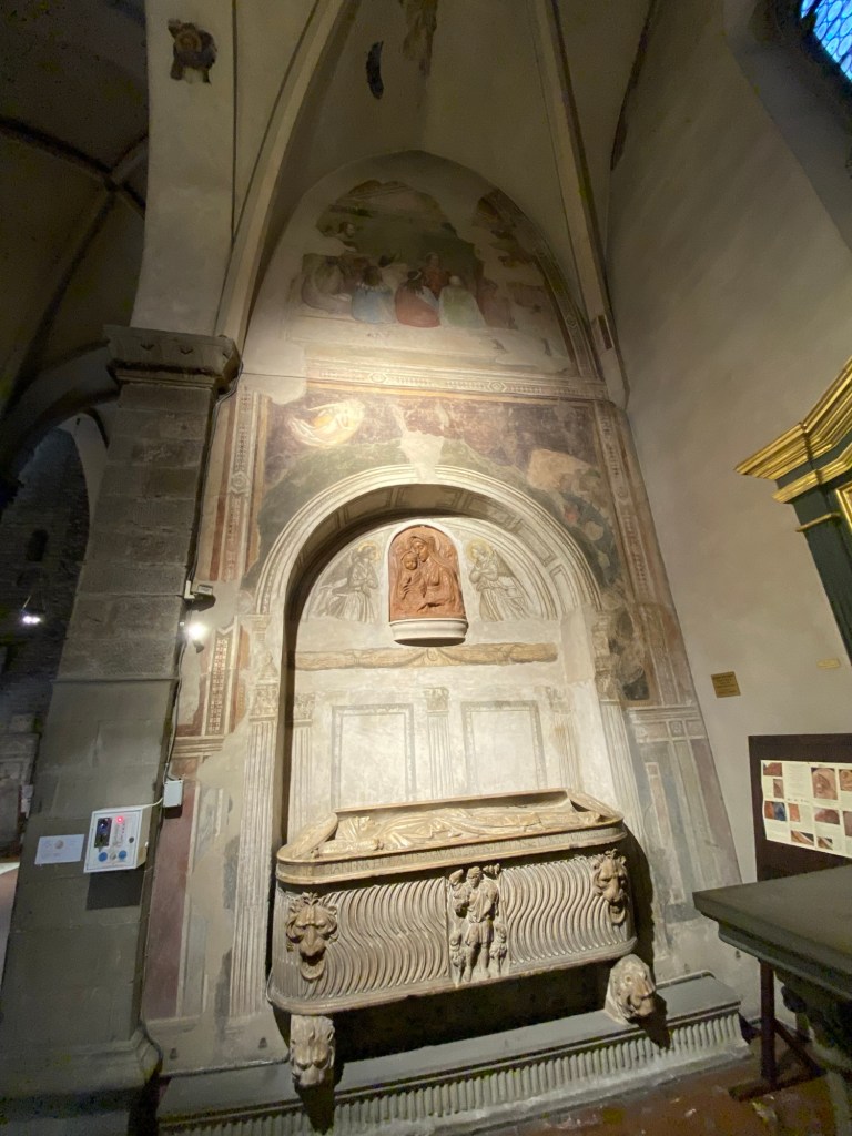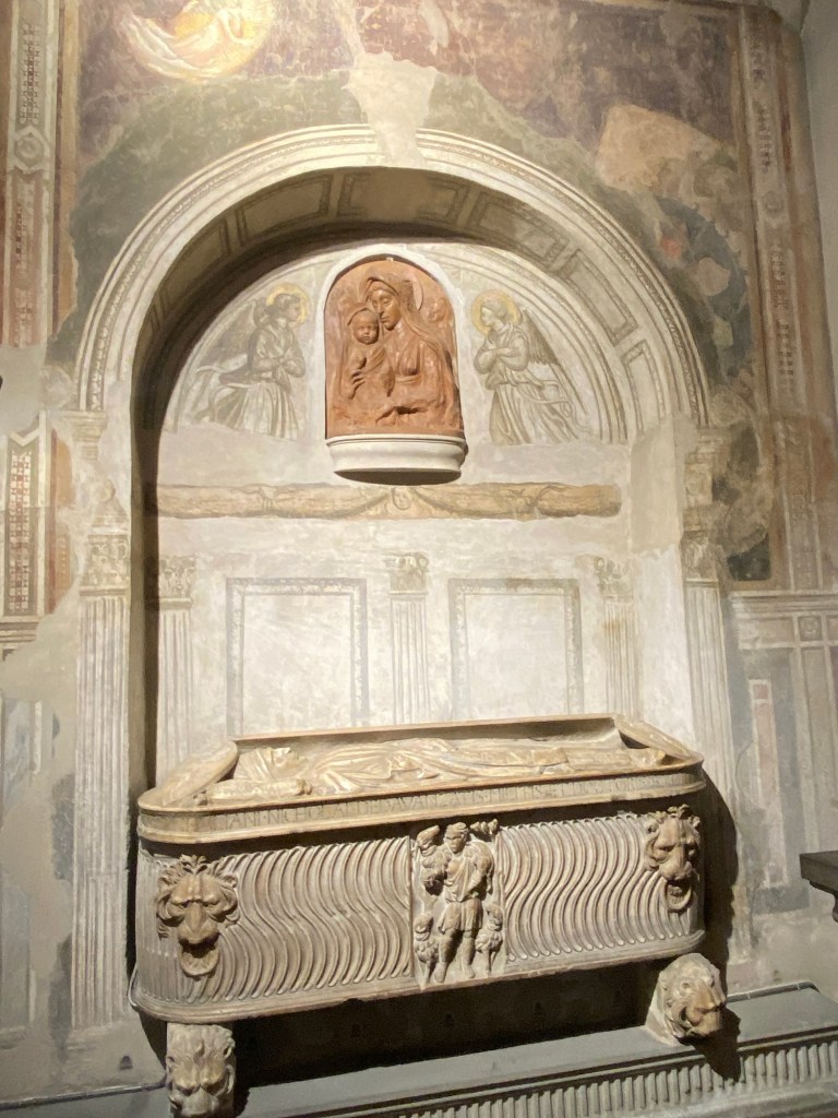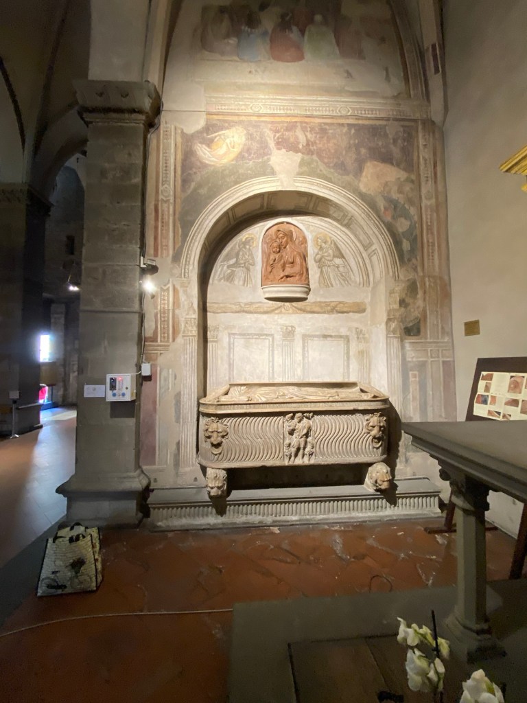 In the Davanzati chapel is the funeral monument of Giuliano Davanzati. This is comprised of a Roman sarcophagus from the 3rd C AD, topped with a lid of a recumbent figure of the deceased, which has been attributed to the renowned Renaissance artist Bernardo Rossellino. It is said that the sculpture depicts a shepherd with lambs, interpreted in a somber, almost monastic manner.