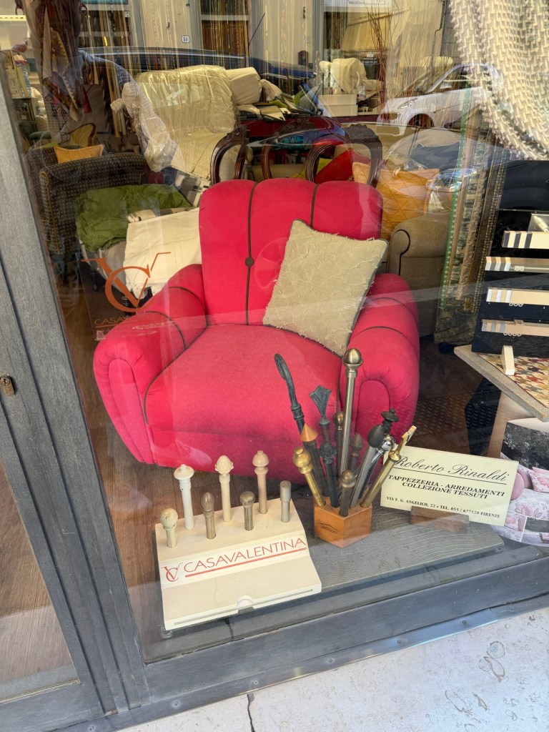 Passing a local upholstery business, I see the proprietor working in the back of the shop.