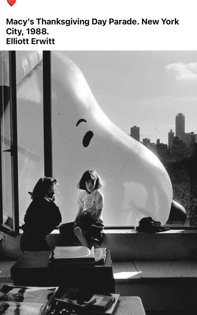 This photograph is such a perfect example of Elliott Erwitt’s ability to find poetry in the everyday. The huge Snoopy balloon passing outside the window creates a wonderful contrast with the quiet, almost private moment happening indoors. The two girls seem caught between ordinary life and something unexpectedly magical drifting by behind them.