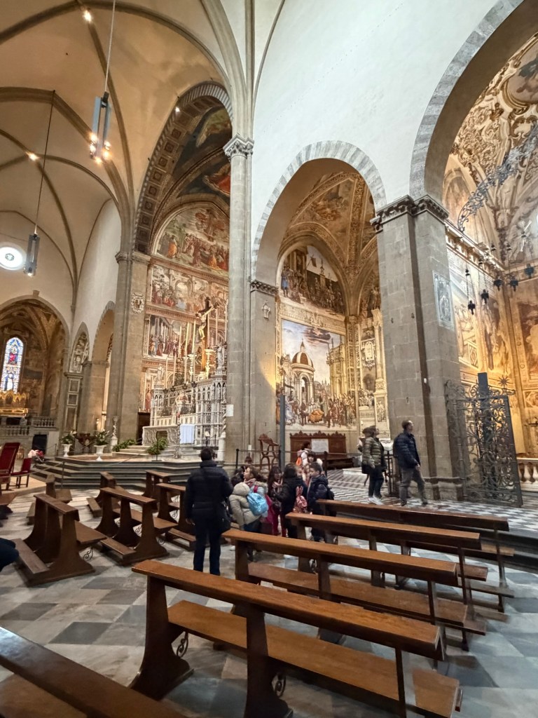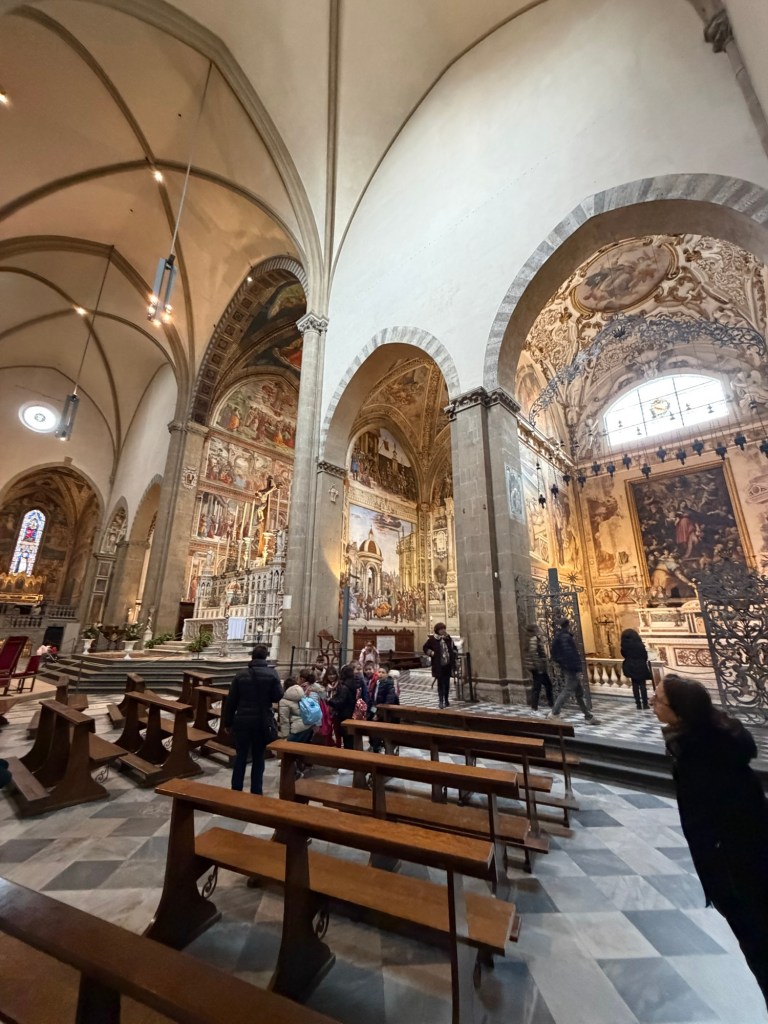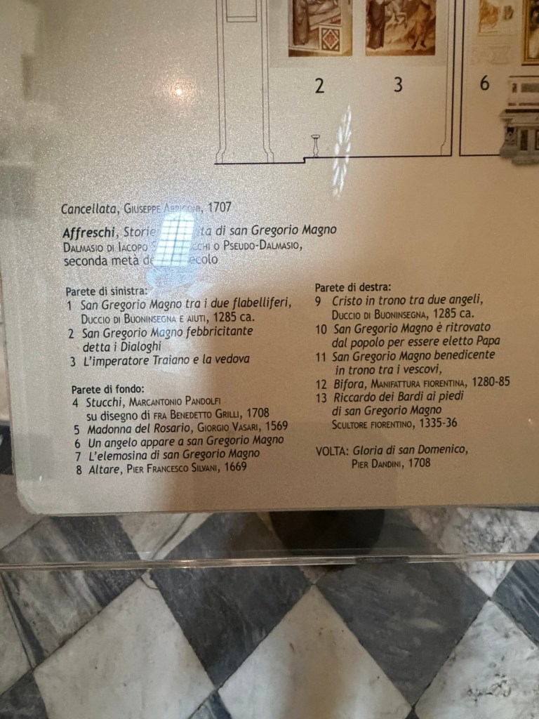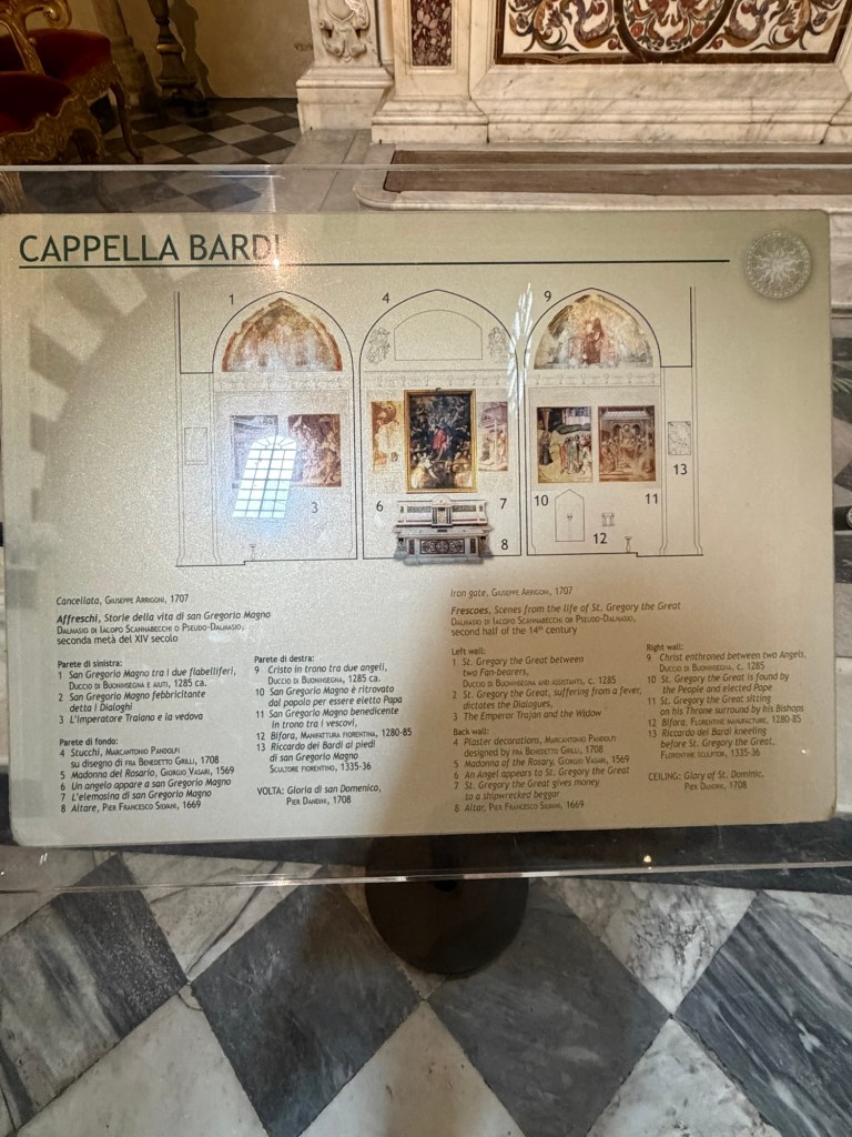 On my recent visit to the basilica, I took a long look and some photos in particular of The Bardi Chapel (also known as the Chapel of San Gregorio, the Chapel of the Sacrament, or, since 1715, the Chapel of San Domenico) is the first chapel on the right when entering the transept, situated between the Tornabuoni Chapel and the Filippo Strozzi Chapel.