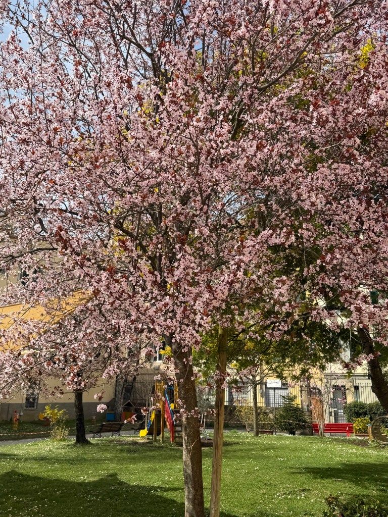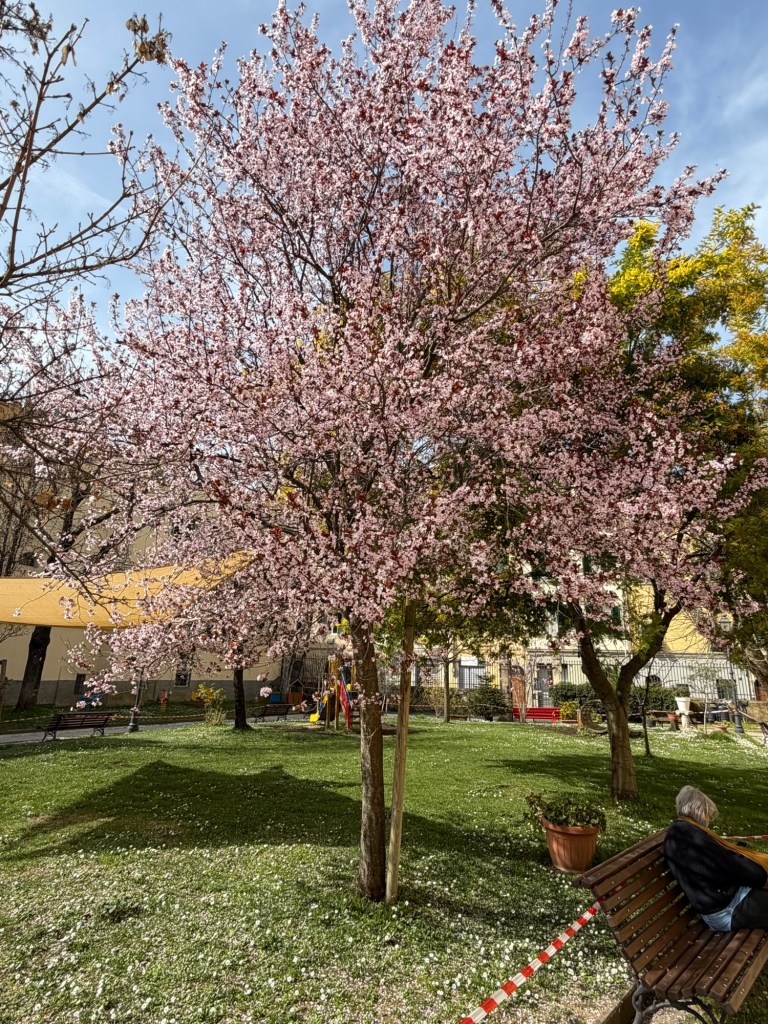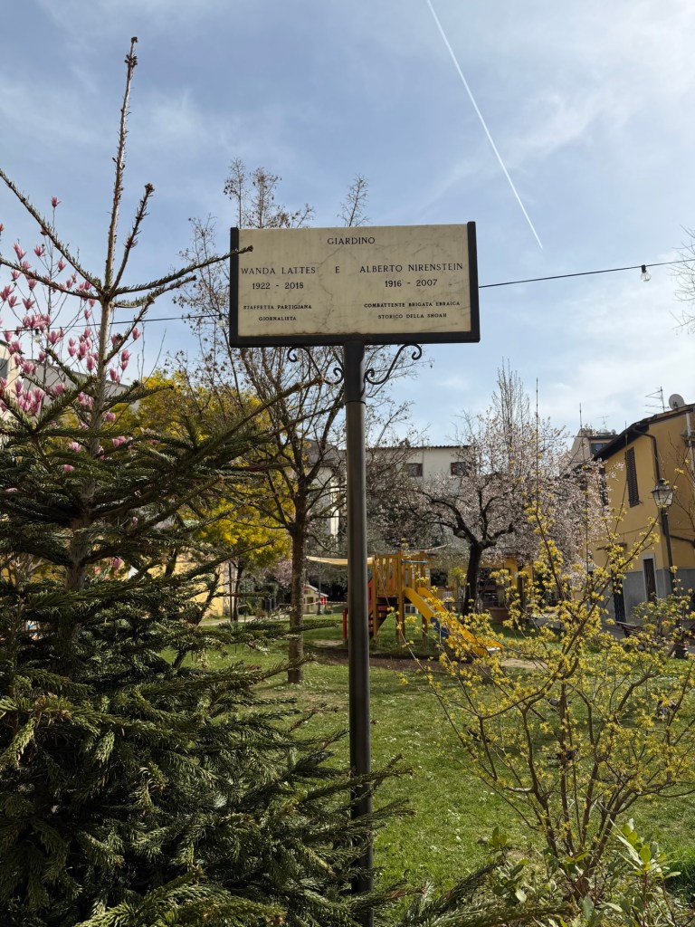 You know me. You know I want to know the history behind the dedication. I learned that this space was originally part of a monastic orchard and it in its present form it was officially dedicated on Sept. 20, 2021 to Wanda Lattes (1922-2018), a partisan courier and journalist, and her husband Alberto Nirenstein (1916-2007), a historian of the Shoah and fighter in the Jewish Brigade.