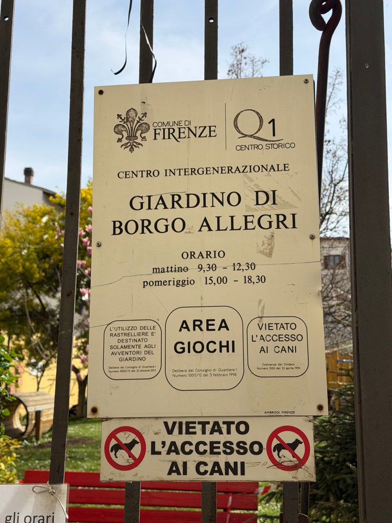 You never know when a random walk will introduce you to a new part of Florence! Many times I have walked down this street and peered into the garden, but it has always been locked up. It is open on a daily basis, just not when I happened to be passing by previously.