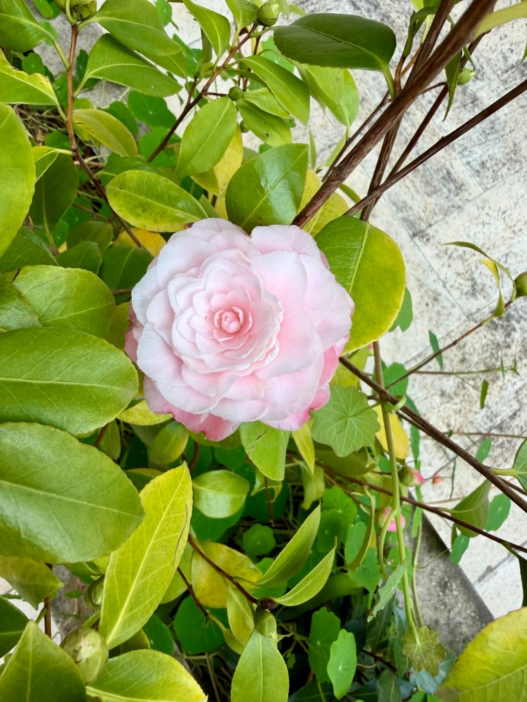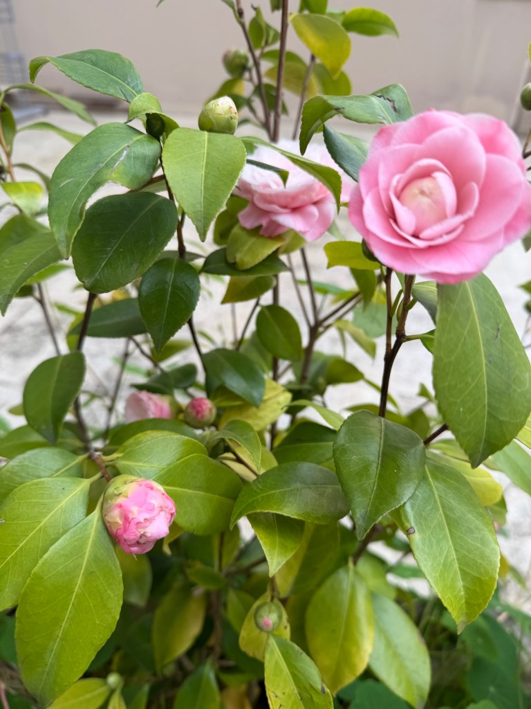 I have a 2nd camellia shrub just now springing into bloom. It has a more delicately shaded pink and white coloring than my first one that you have already seen blooming away.