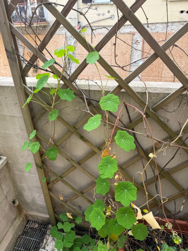 Below, back at my terrace garden at home. My nasturtiums plants survived the winter! I am still surprised by that!