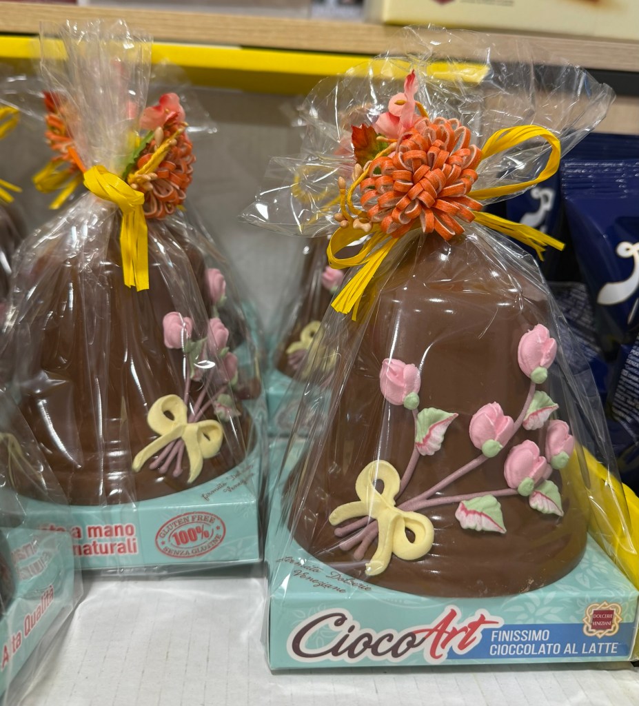 Chocolate eggs wrapped I. Yellow cellophane and bells! Below, La Colomba, the traditional Italian dove-shaped Easter bread.