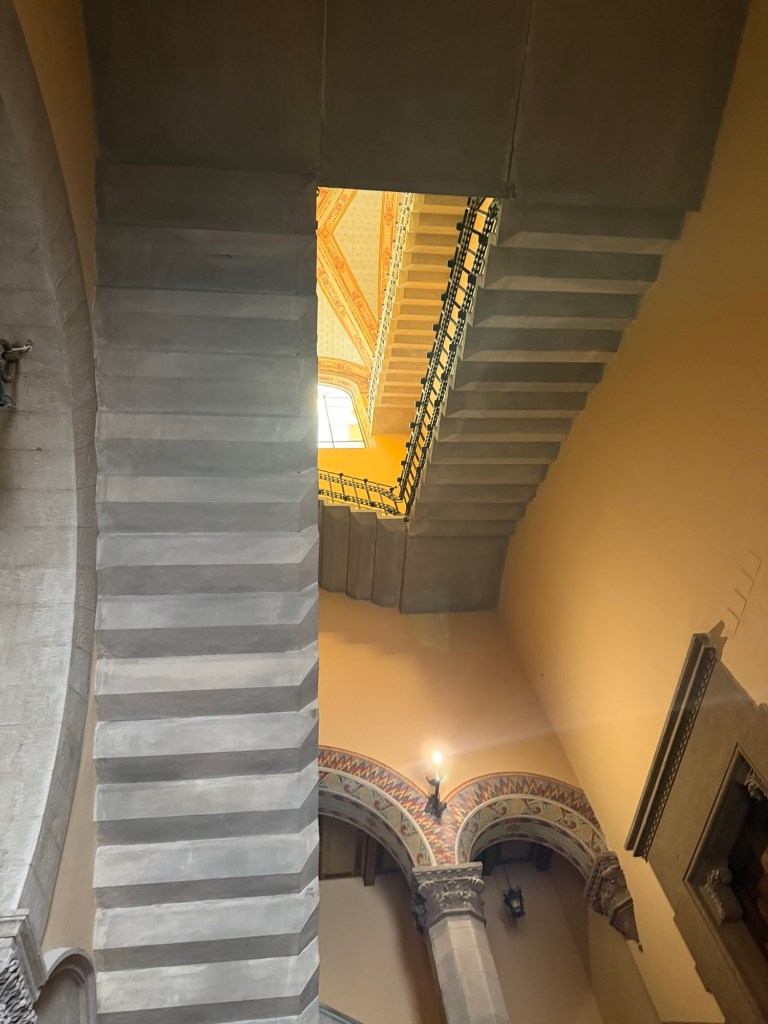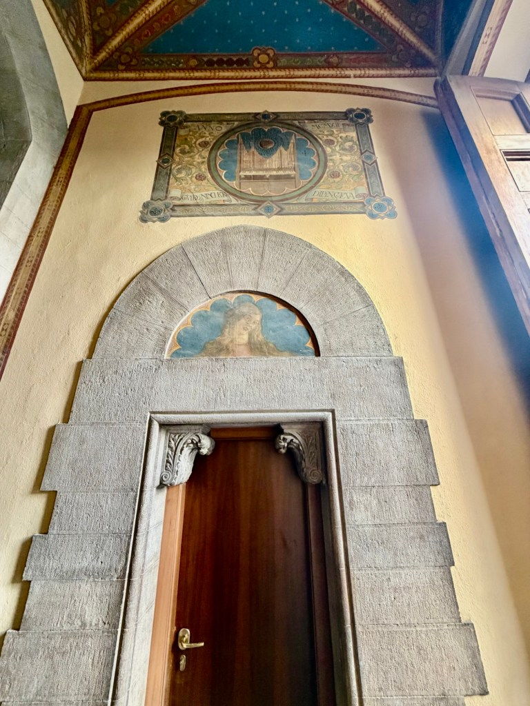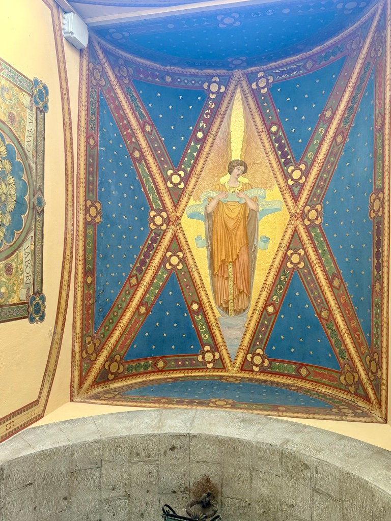 High over this simple but stunningly stone encased doorway is a fresco that provides the name of the painter and the year of its execution. Translated it reads: In the year 1912 Guido Nincheri was the painter.”