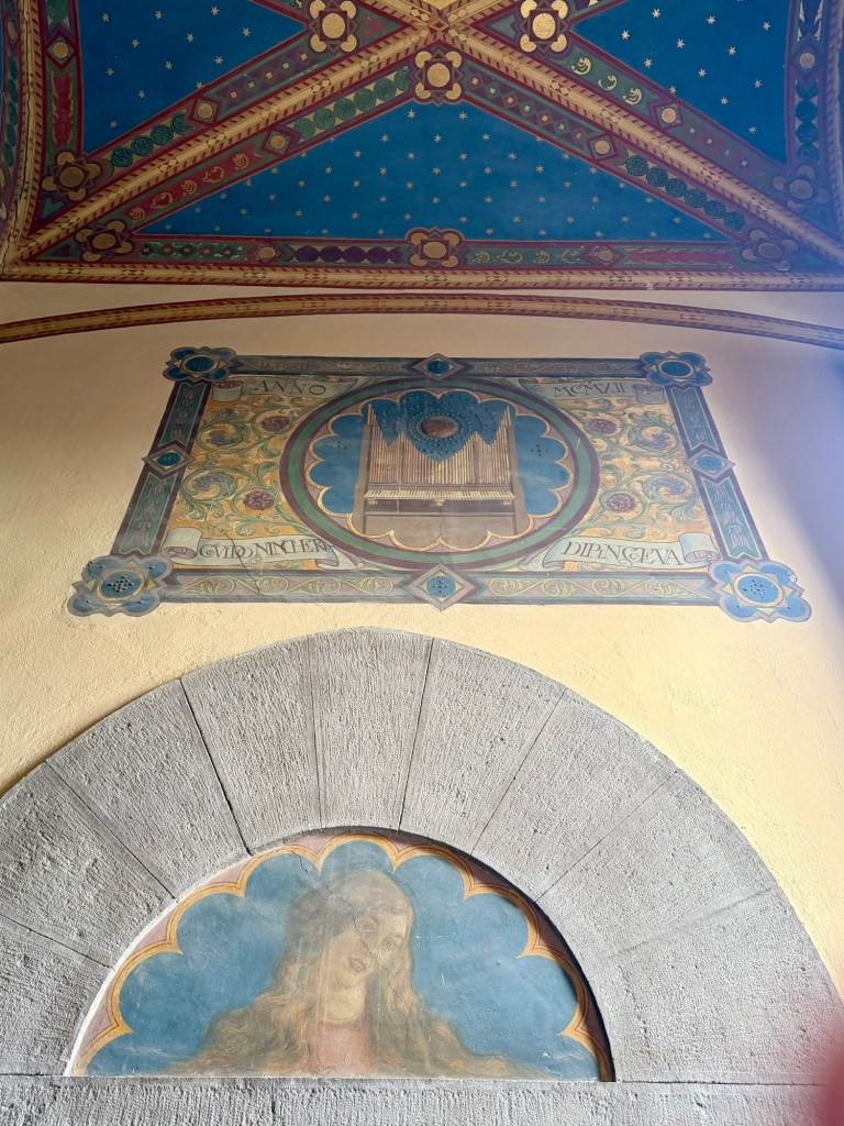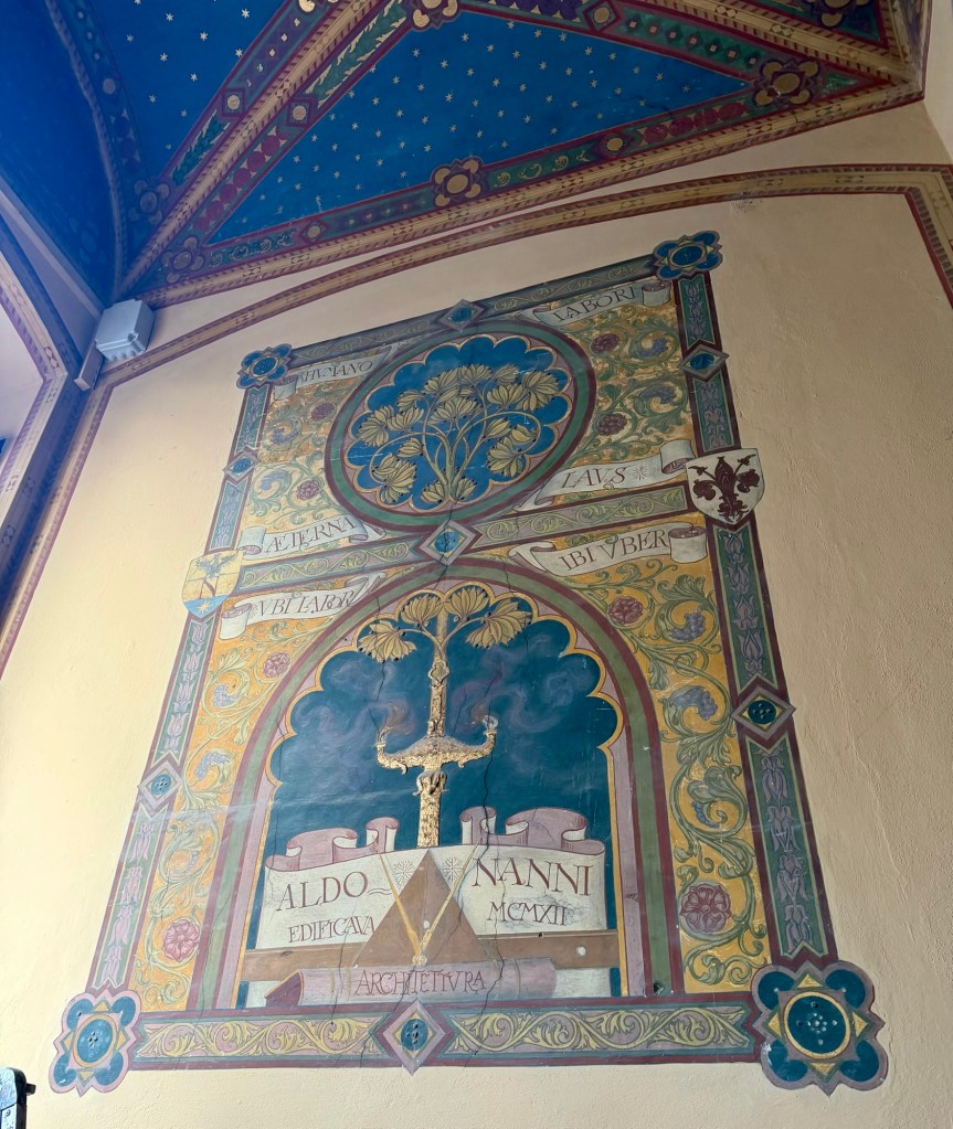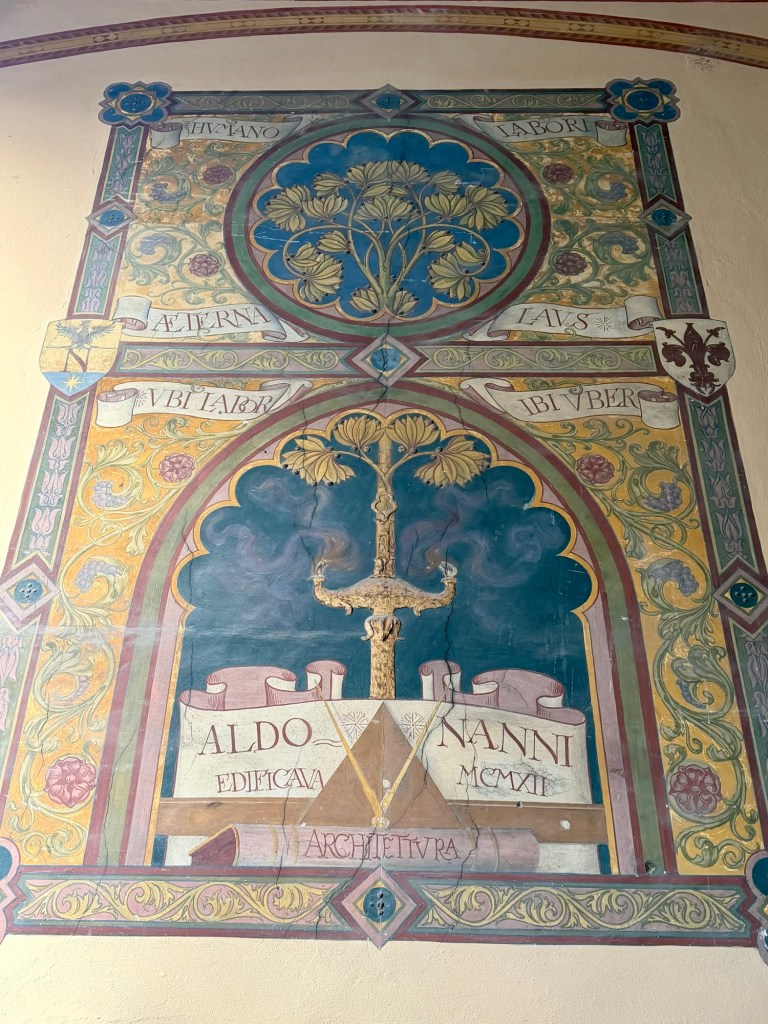 The fresco paintings I would judge to be from the late 19th, early 20th century and there is one painting, seen above, that records a name and date! This is not always the case. Aldo Nanni, built this, in 1912 it says. At the bottom it says he was the architect.