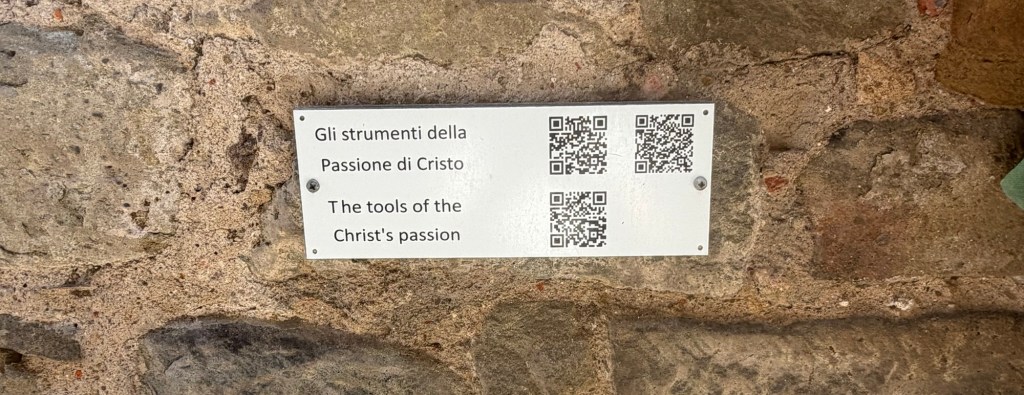 On the side of a building was a gruesome installation of the tools of Christ’s passion. You can tell this is a popular site with the QR codes added to the sign. Wow! What a modern thing on an ancient wall!