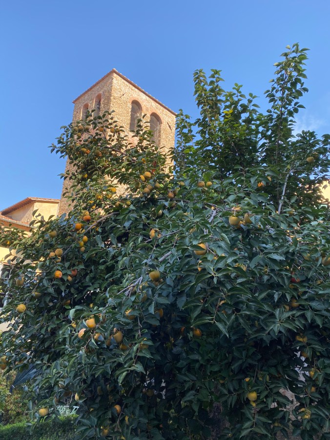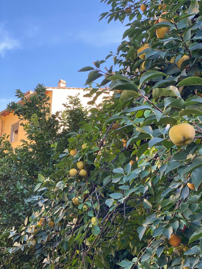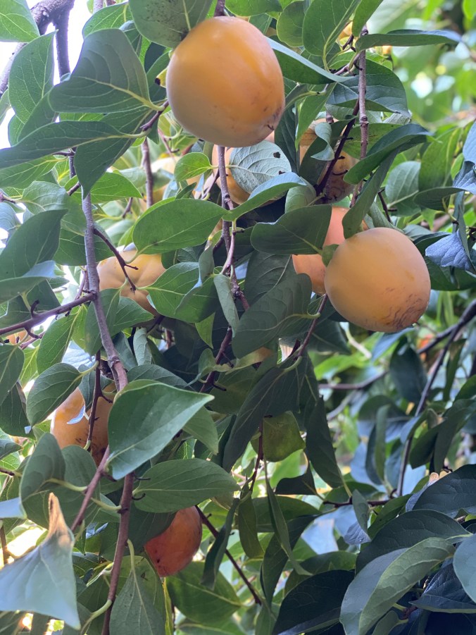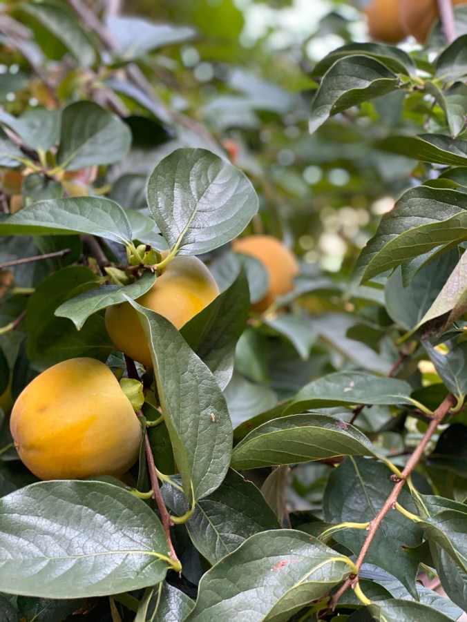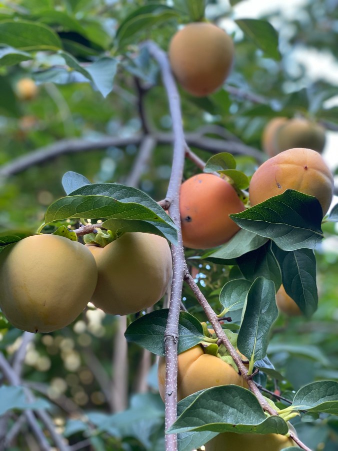The persimmons are beginning to ripen in shades of yellow, gold and coral.