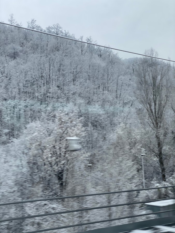 There was no snow in Florence or Milan when I left home, but on the train ride home today, I saw that winter has made its arrival felt somewhere south of Milan. It made me happy to see it.