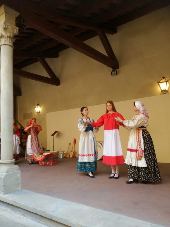My friend and I were rendezvousing at the Piazza San Marco recently and noticed that there was music pouring out of the door leading to a small cortile to the left of the church. We followed the sound and happened upon a troupe of Russian singers and dancers who were performing in the beautiful autumn afternoon under the 500 year old roof of the cortile.