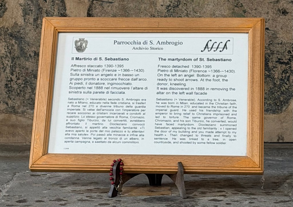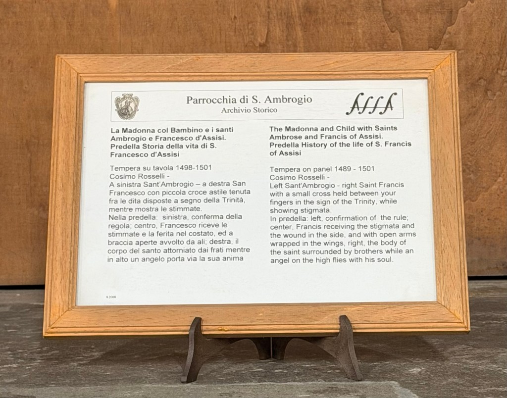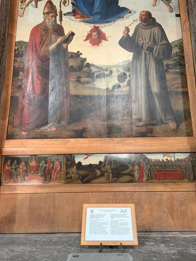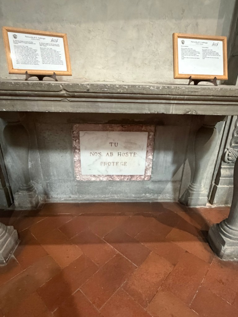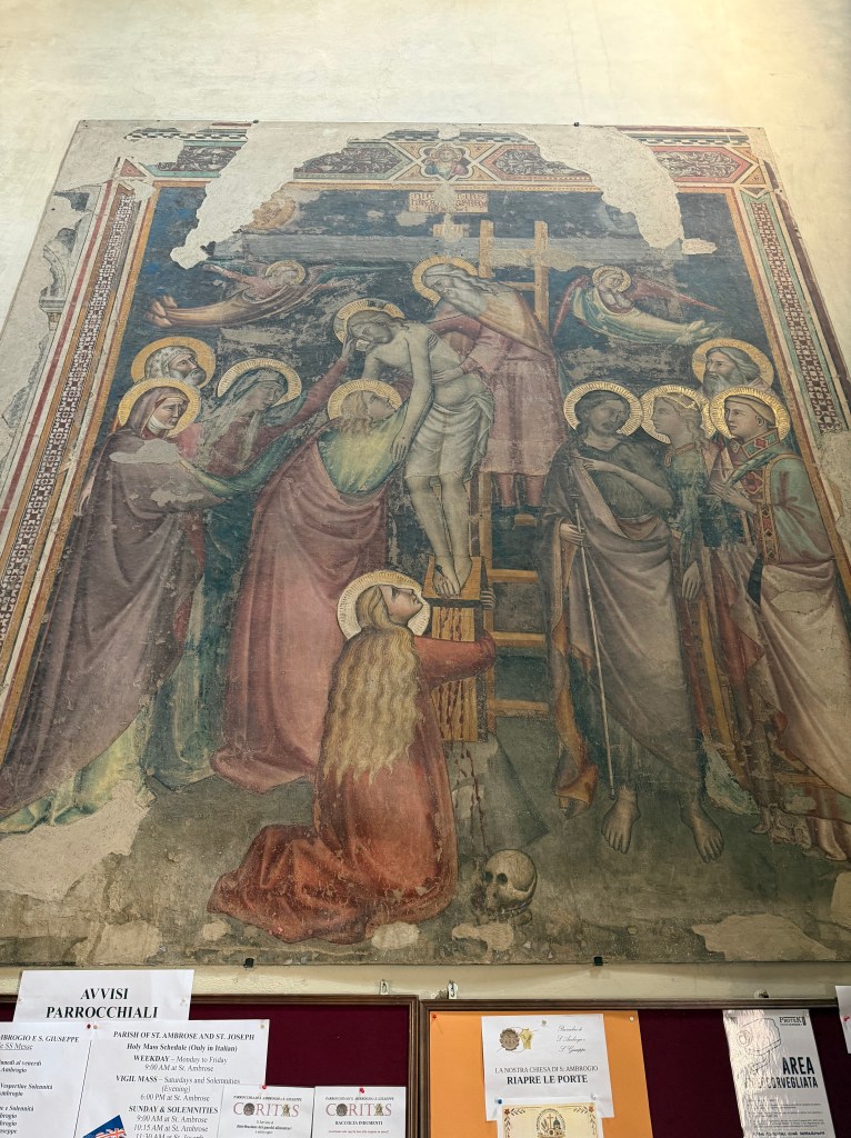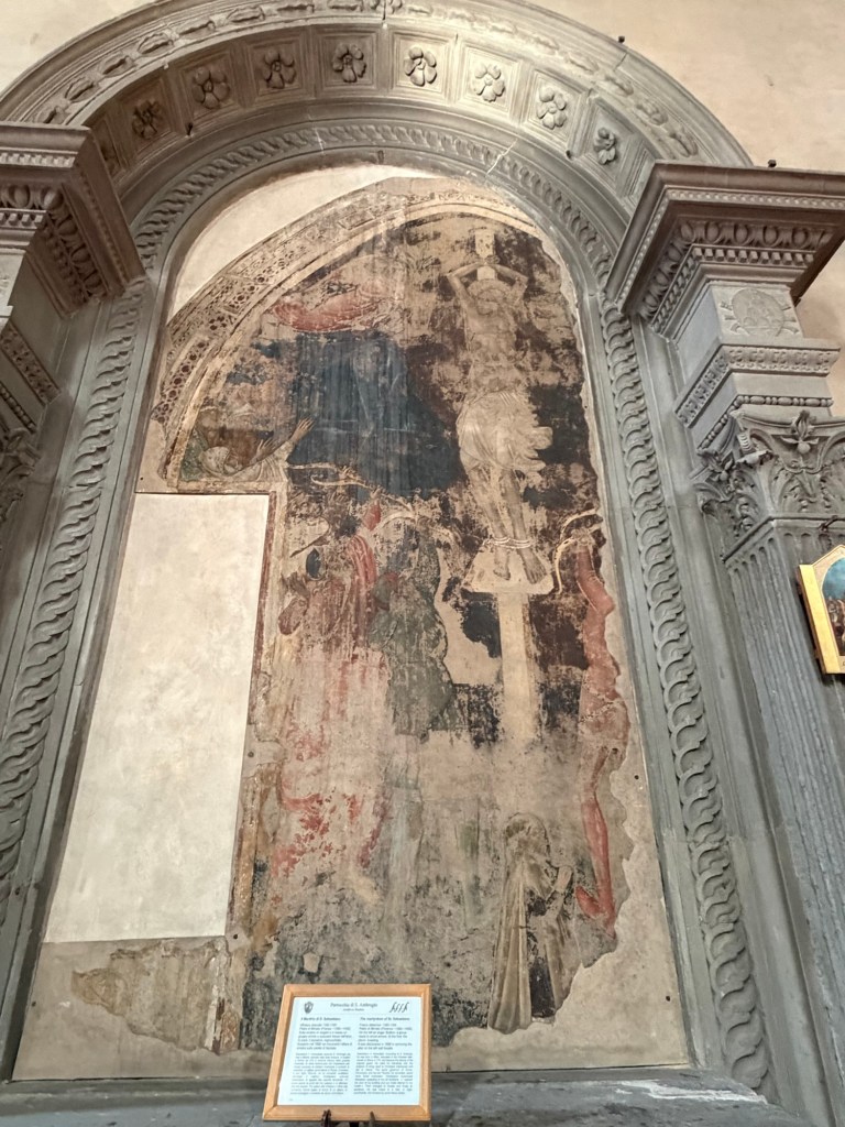 Before looking up closely at the beautiful fresco, let me remind you that the church is named for Saint Ambrose, the Bishop of Milan, who stopped at this site in 393. A chapel for a convent of Benedictine nuns had been built here as early as the 7th century, and the location of the church itself has been dated to the 11th century. This location was outside the first city walls of Florence, until the erection of the Arnolfo circle of walls dating to 1284-1310.