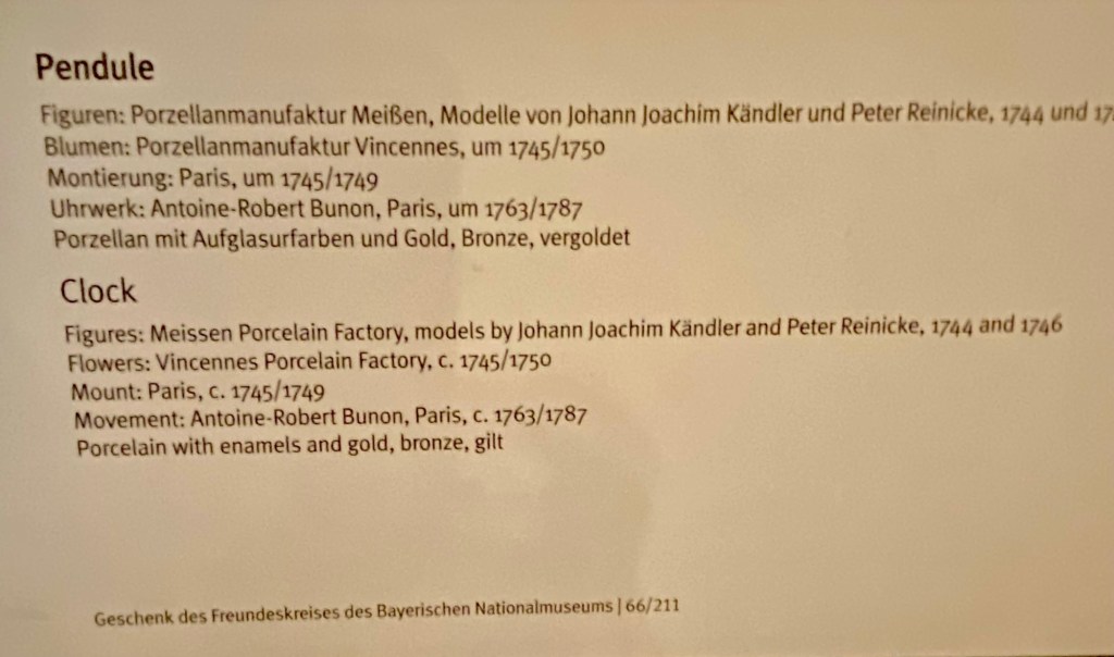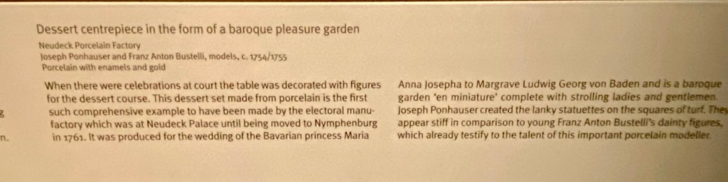 The museum is famous for its collections of courtly culture, musical instruments, furniture, oil paintings, sketches, clocks, stoneware, majolica, miniatures, porcelain and faience, and its statues. It has probably the world’s best collection of the Nymphenburg porcelain figures of Franz Anton Bustelli (1723–63).