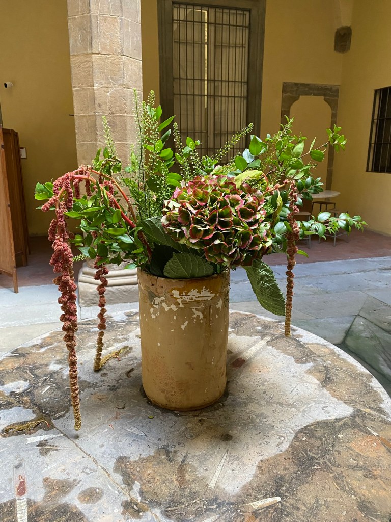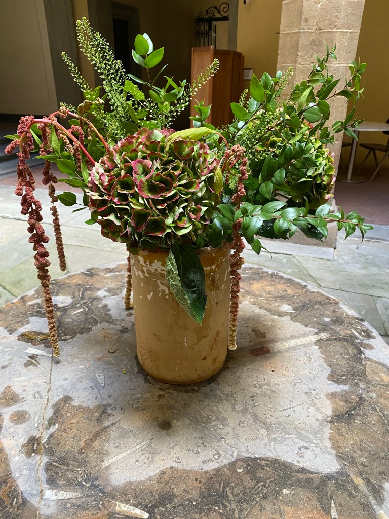 Over the well in the center of the 15th century Renaissance courtyard of the Palazzo Galli Tassi you will often see a beautiful seasonal flower arrangement. When my language classes resumed in this building this past week, this was the loveliness that awaited.