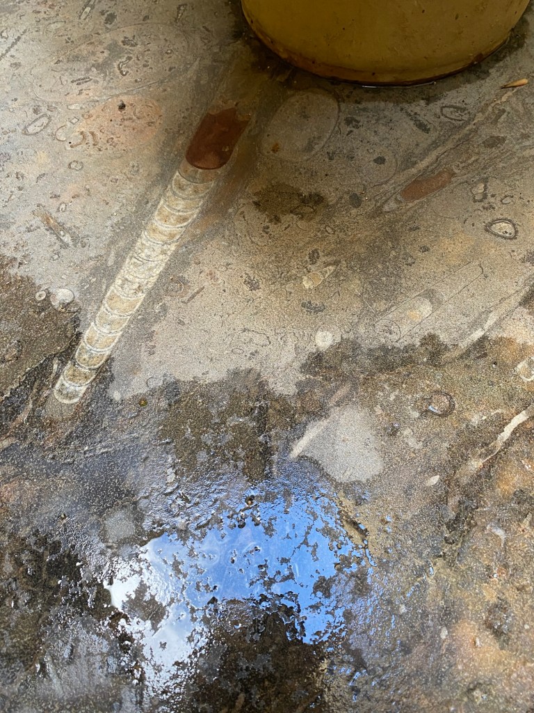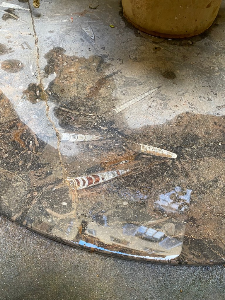 On the block of stone that serves as the table top, you can see fossils embedded in the stone. It is quite something.